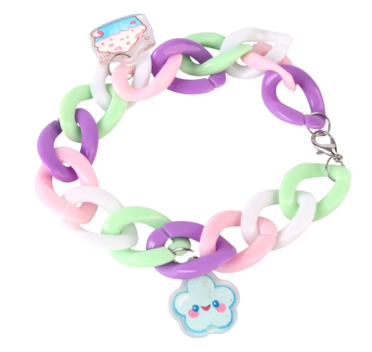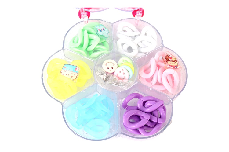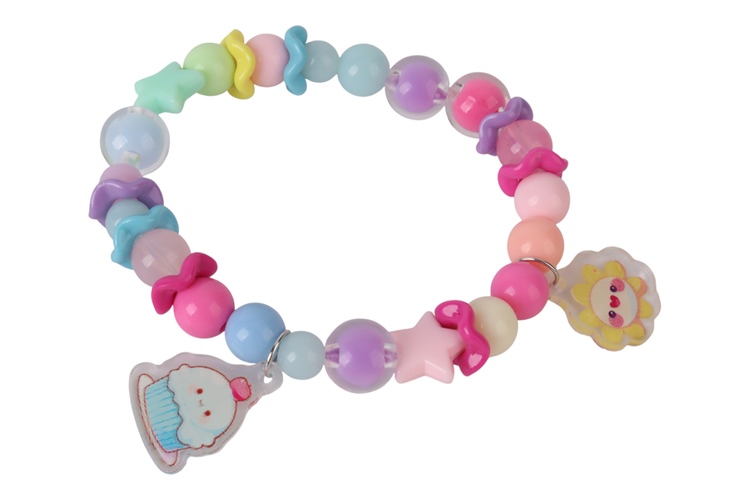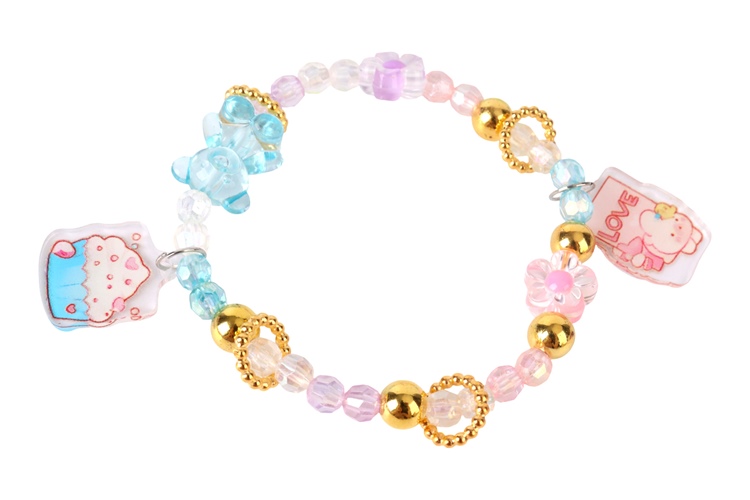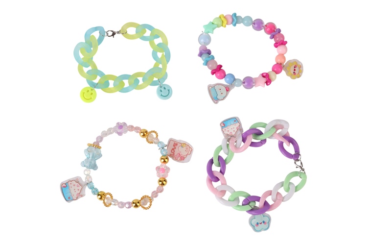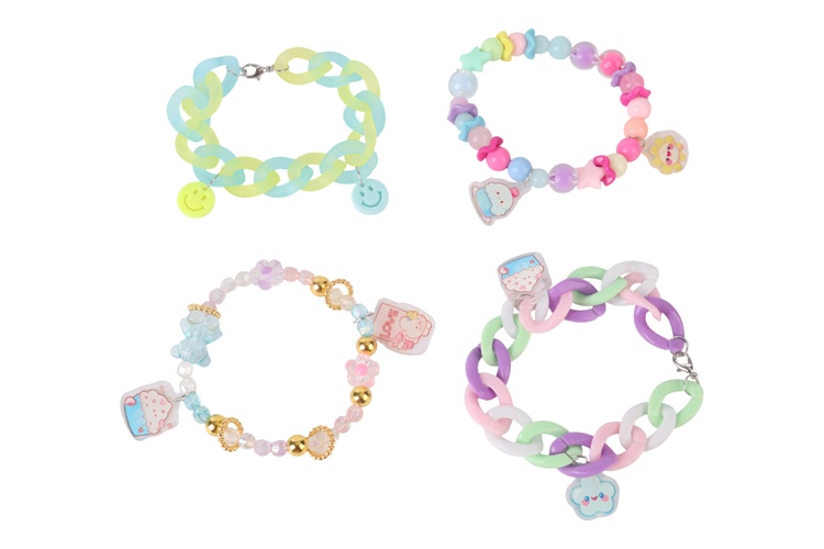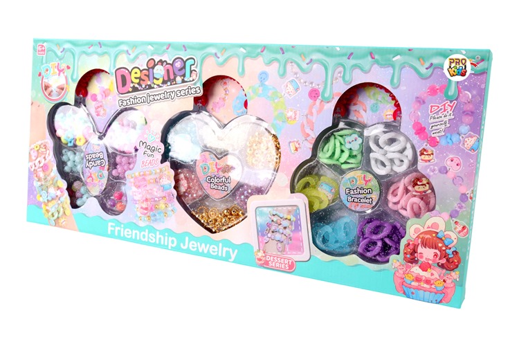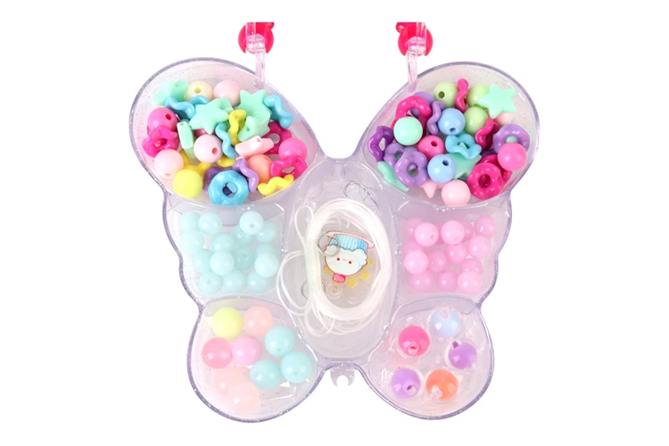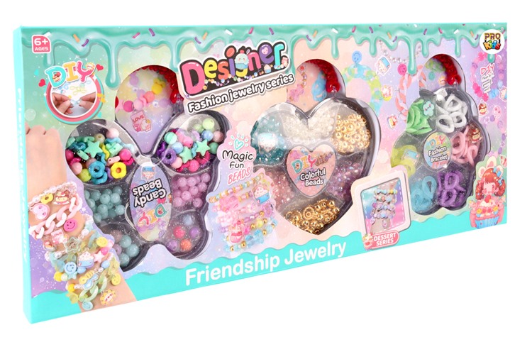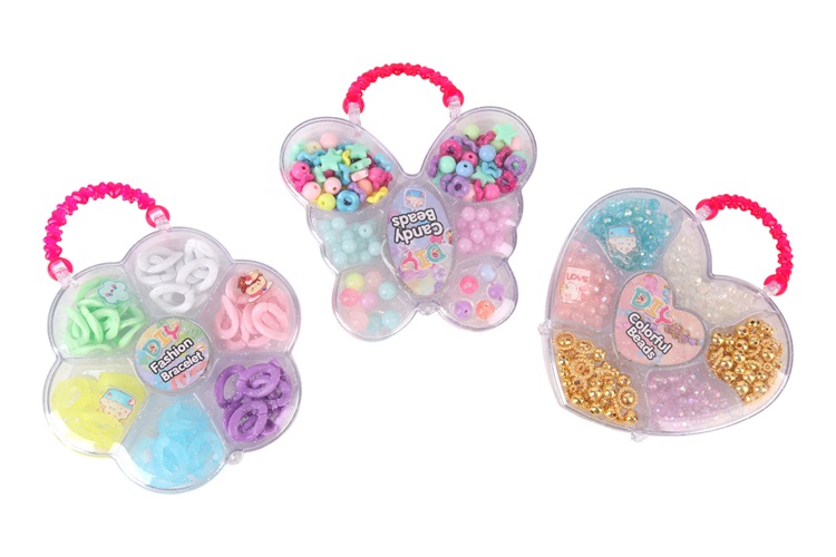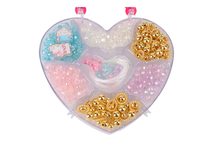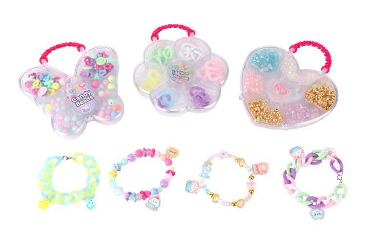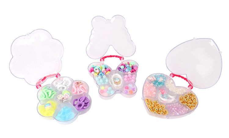 Zawartość zestawu: trzy pudełka w kształcie serca, kwiatu i motyla, koraliki w pastelowych i metalicznych kolorach, zawieszki dekoracyjne, elastyczne żyłki i przykładowe elementy do tworzenia kilku bransoletek