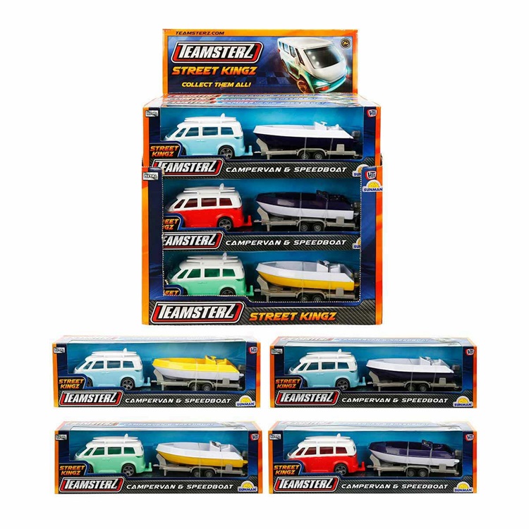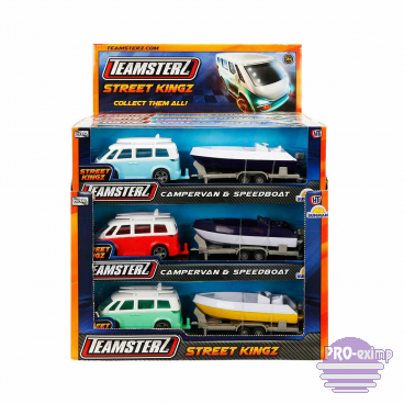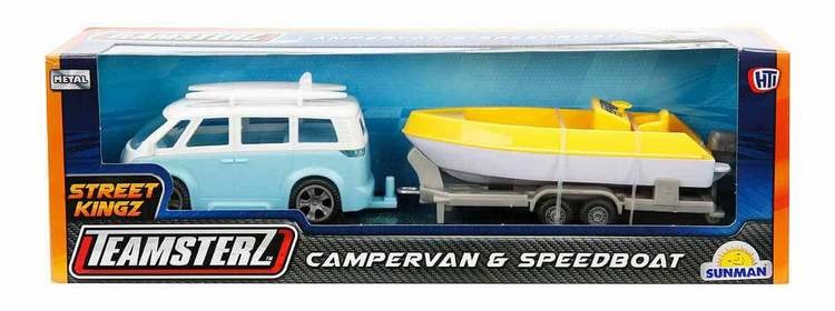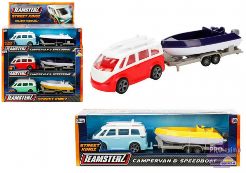 Wyrusz w drogę ku wakacyjnej przygodzie z zestawem Teamsterz Street Kingz Campervan & Speedboat! Ten realistycznie wykonany model łączy w sobie wszystko, czego potrzeba do letniej wyprawy  stylowy kamper oraz przyczepę z motorówką, gotową do wodnych szaleństw.