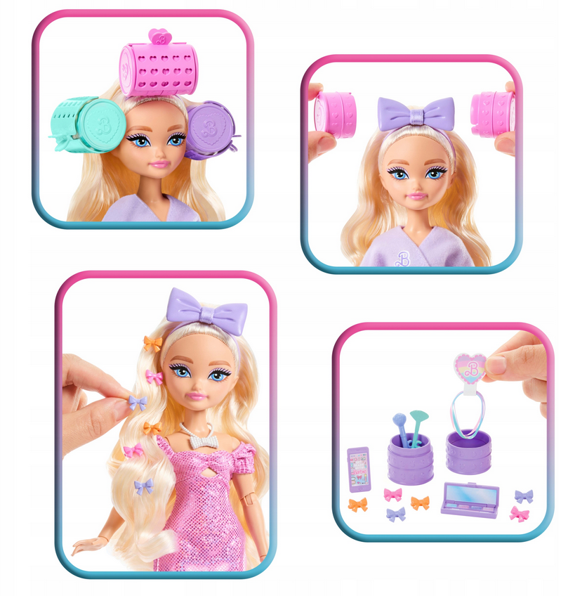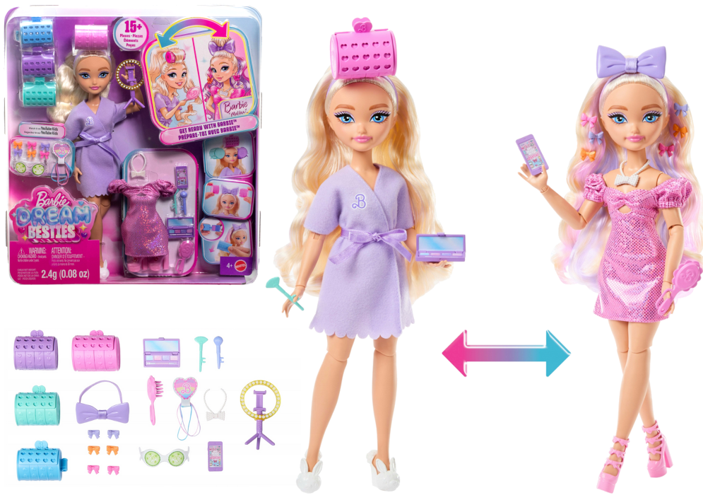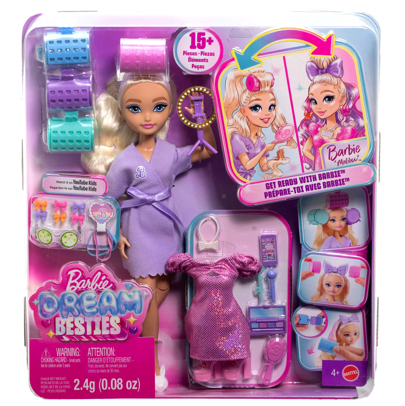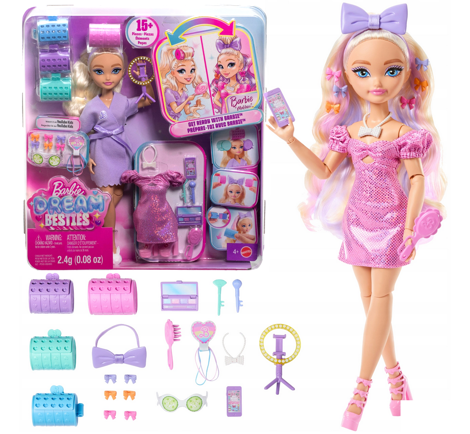 Barbie Dream Besties Malibu to stylowa lalka, która zaprasza do świata mody, pielęgnacji i kreatywnej zabawy. Zestaw inspirowany jest tematyką przygotowań do wyjścia oraz stylizacji włosów, dzięki czemu dziecko może tworzyć własne fryzury i modowe metamorfozy. Lalka posiada długie blond włosy z pastelowymi pasemkami, które można modelować za pomocą dołączonych wałków, spinek oraz innych akcesoriów.