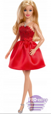 Długie, blond włosy, delikatny makijaż oraz stylowe dodatki nadają lalce szykowny, wieczorowy wygląd. Srebrne sandałki na obcasie i subtelny naszyjnik z motywem serca dopełniają stylizację, tworząc gotową kreację na wielkie wyjście.