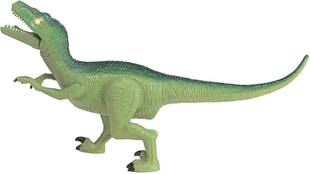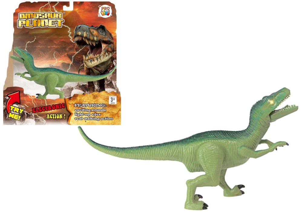 Model Velociraptora wykonany został z niezwykłą starannością, by jak najwierniej oddać jego charakterystyczną sylwetkę: smukłe ciało, długi ogon, zakrzywione pazury i przenikliwy wzrok. Po uruchomieniu zabawki oczy drapieżnika rozświetlają się jasnym światłem, a z głośnika dobiega autentyczny ryk, który wprowadza atmosferę prawdziwego spotkania z prehistorycznym łowcą.