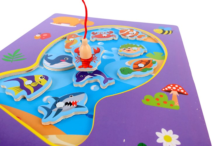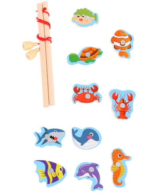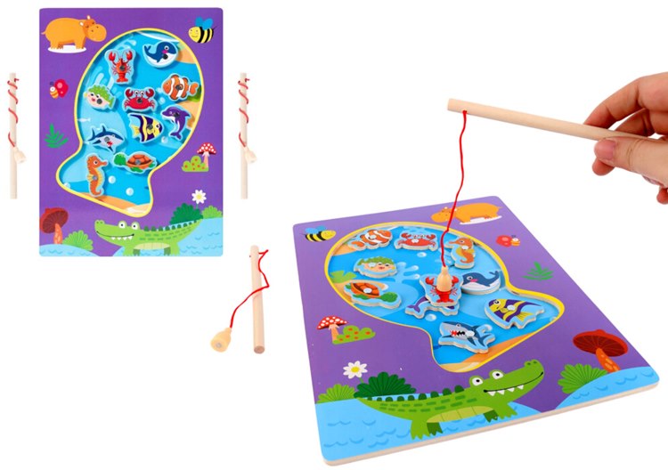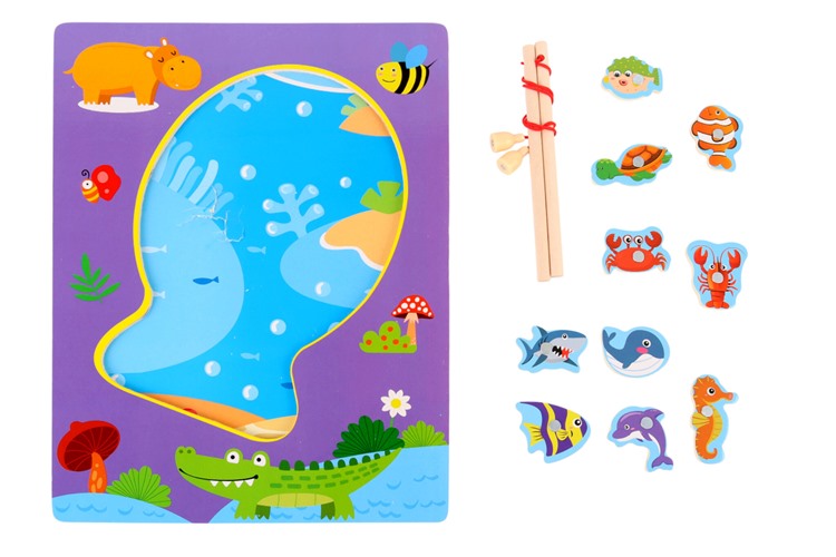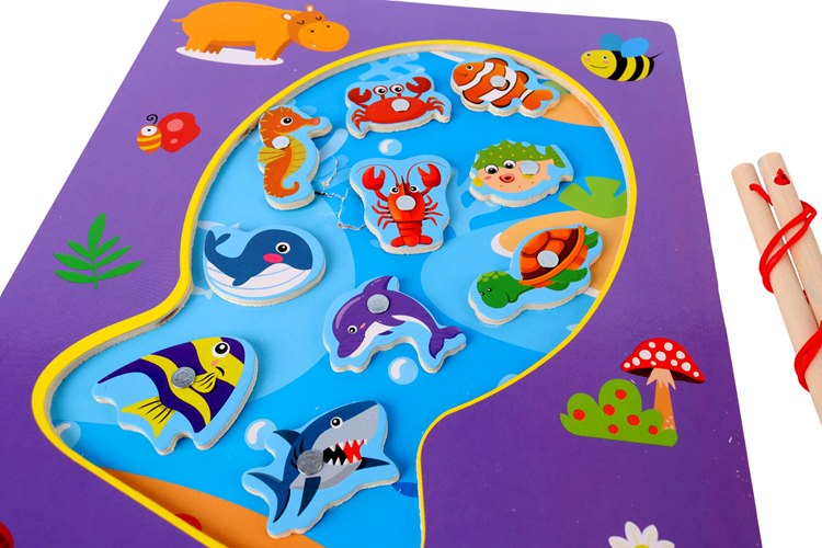 Drewniana gra Łowienie rybek na magnes No.2 to pełna kolorów zabawa, która rozwija zręczność, spostrzegawczość i koncentrację dziecka. Na planszy przedstawiającej wodny świat w bajecznej oprawie graficznej znajduje się dziewięć uroczych morskich stworzeń, takich jak rybki, konik morski, żółw, krab czy delfin. Każdy element posiada wbudowany magnes, dzięki czemu można go wyławiać przy pomocy dwóch wędek z magnetycznymi przynętami.