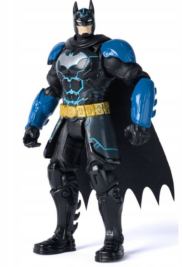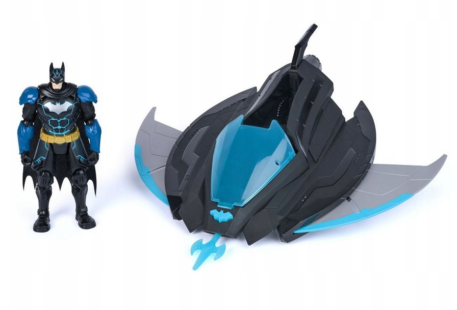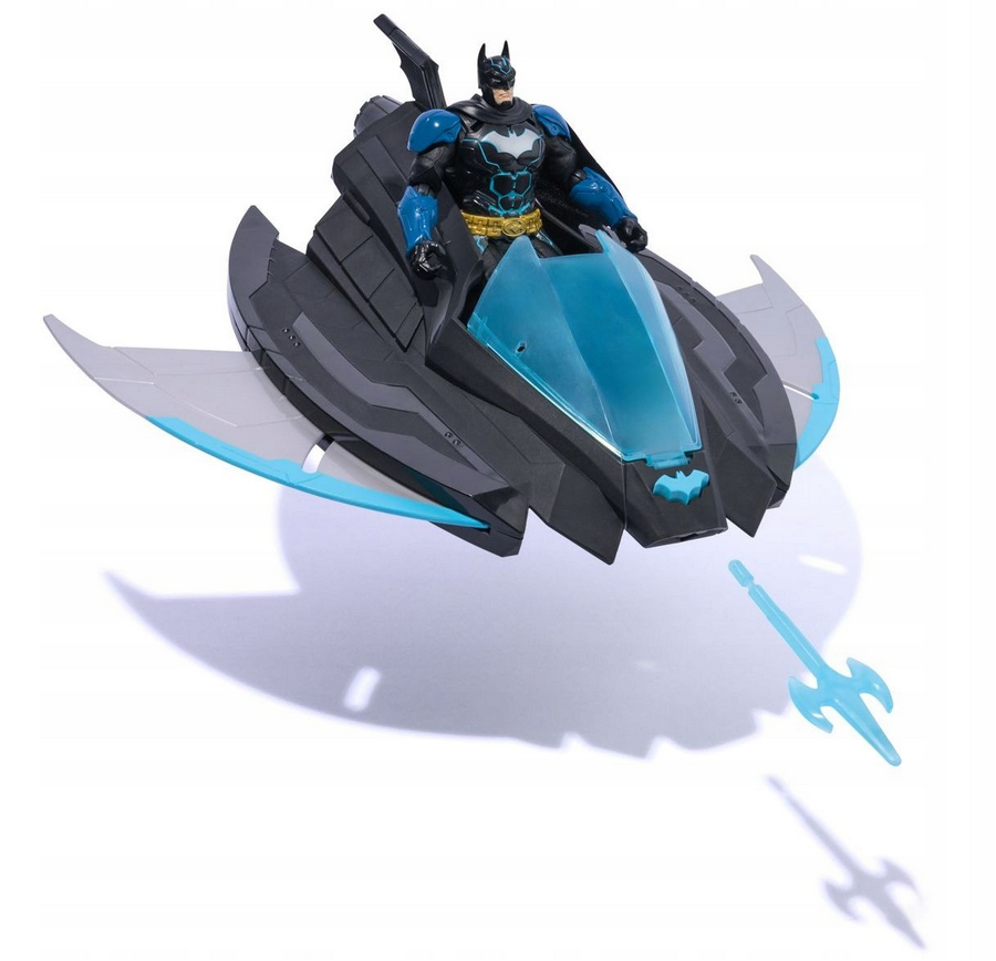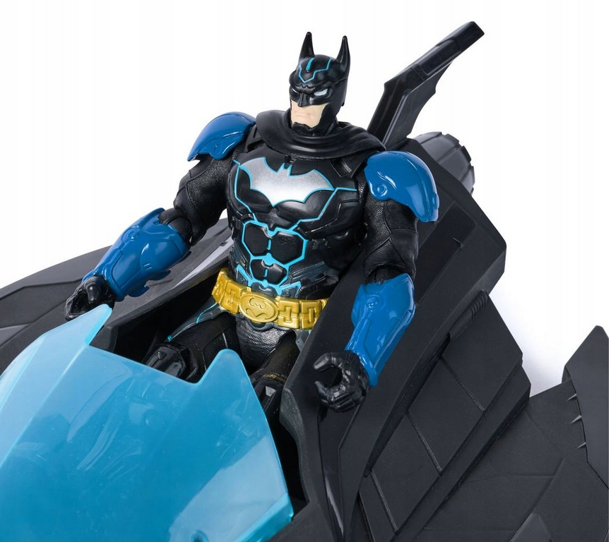 W zestawie znajduje się również figurka Batmana z detalami w kolorach czarnym i niebieskim, z peleryną i charakterystycznym symbolem nietoperza na piersi. Połączenie pojazdu i figurki pozwala tworzyć dynamiczne scenariusze zabawy inspirowane światem DC.