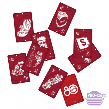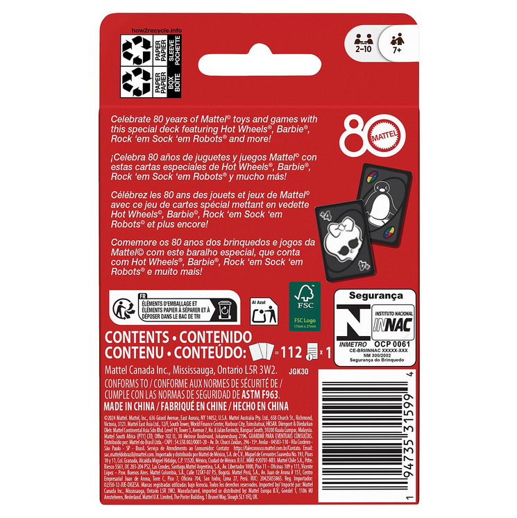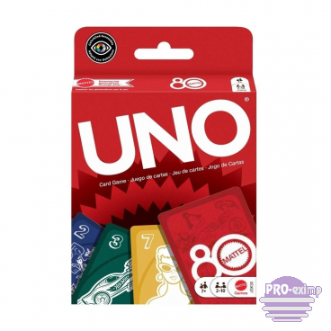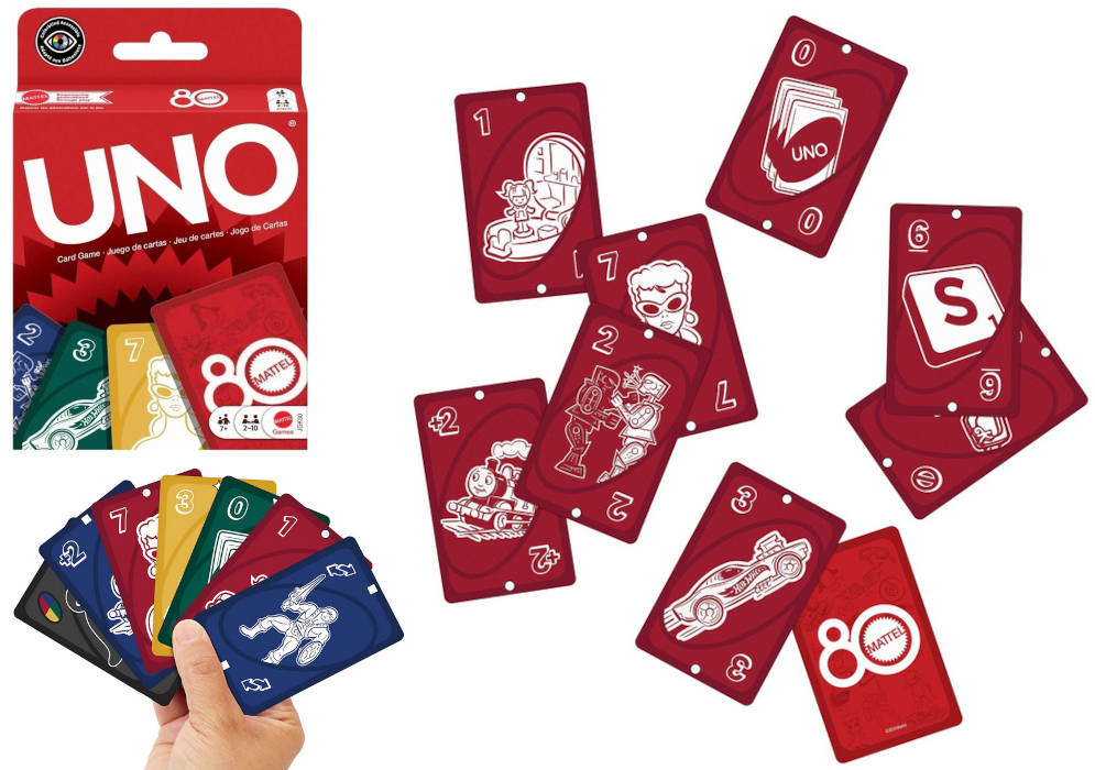 OPIS:Klasyczna gra karciana UNO powraca w wyjątkowej odsłonie stworzonej z okazji 80-lecia marki Mattel. Ta specjalna edycja celebruje historię jednej z najbardziej znanych firm zabawkarskich na świecie. Na kartach pojawiają się ilustracje inspirowane kultowymi postaciami i produktami Mattel - m.in. Barbie, Hot Wheels czy Rock -Em Sock -Em Robots.
