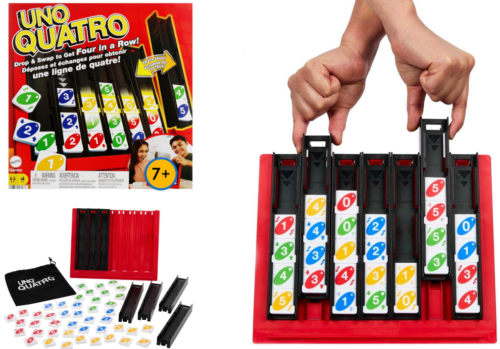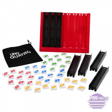 UNO Quatro to dynamiczna gra strategiczna od Mattel Games, która łączy zasady znanej gry UNO z klasyczną mechaniką układania czterech elementów w jednej linii. Zadaniem graczy jest umieszczanie płytek z numerami i kolorami w pionowych kolumnach planszy, aby stworzyć cztery elementy w jednej linii - w tym samym kolorze lub z tą samą liczbą.
