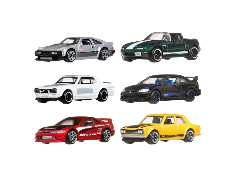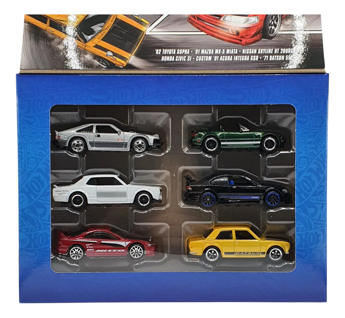 Każdy model został wykonany z dużą dbałością o detale, co widać w odwzorowaniu sylwetki, felg oraz charakterystycznych elementów nadwozia. Zestaw obejmuje takie ikony jak Toyota Supra, Mazda MX-5 Miata, Nissan Skyline, Honda Civic, Acura Integra oraz Datsun 510. To prawdziwa gratka dla kolekcjonerów i fanów japońskich aut.