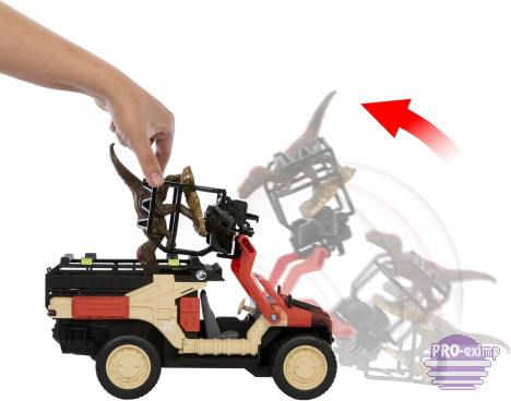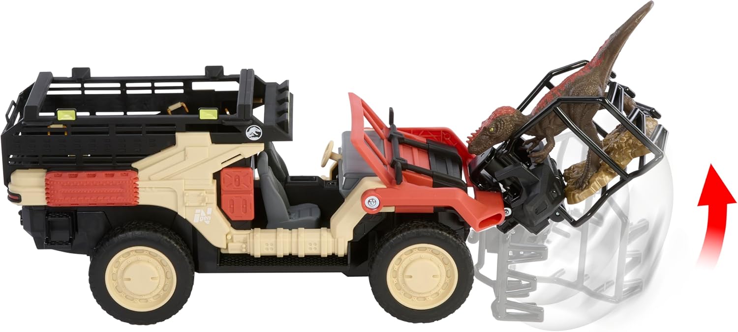 Model wyposażony jest w specjalny mechanizm chwytający, który pozwala podnosić i przewozić dinozaura do tylnej części pojazdu. Dzięki zdalnemu sterowaniu możesz kierować pojazdem w różnych kierunkach i odgrywać sceny inspirowane filmami Jurassic World.