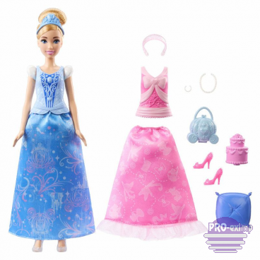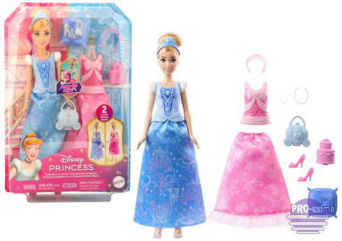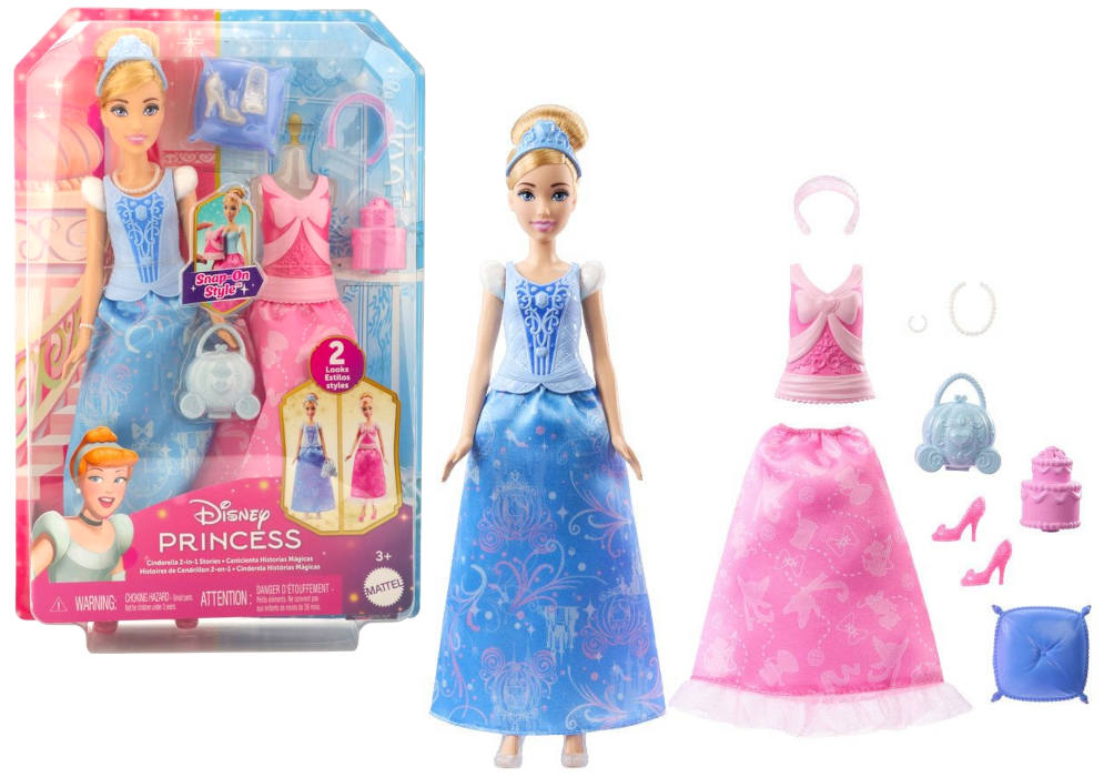 Zestaw zawiera dwa komplety ubrań i dodatki, które można łatwo zmieniać dzięki systemowi -Snap-On Style-. Wystarczy kilka chwil, aby przemienić Kopciuszka z klasycznej niebieskiej sukni w różową stylizację. Dodatkowe akcesoria - torebka, buty czy tort - pozwalają tworzyć nowe scenki i rozwijać wyobraźnię podczas zabawy.
