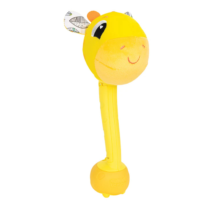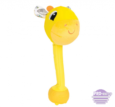 Długa elastyczna rączka została zaprojektowana tak aby była łatwa do uchwycenia przez małe dłonie. Miękka głowa żyrafy oraz kontrastowe detale wspierają rozwój zmysłów i zapewniają bezpieczną zabawę już od najmłodszych lat.