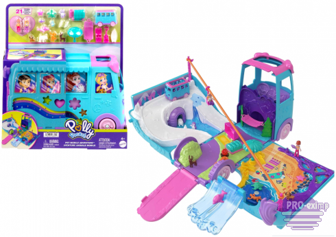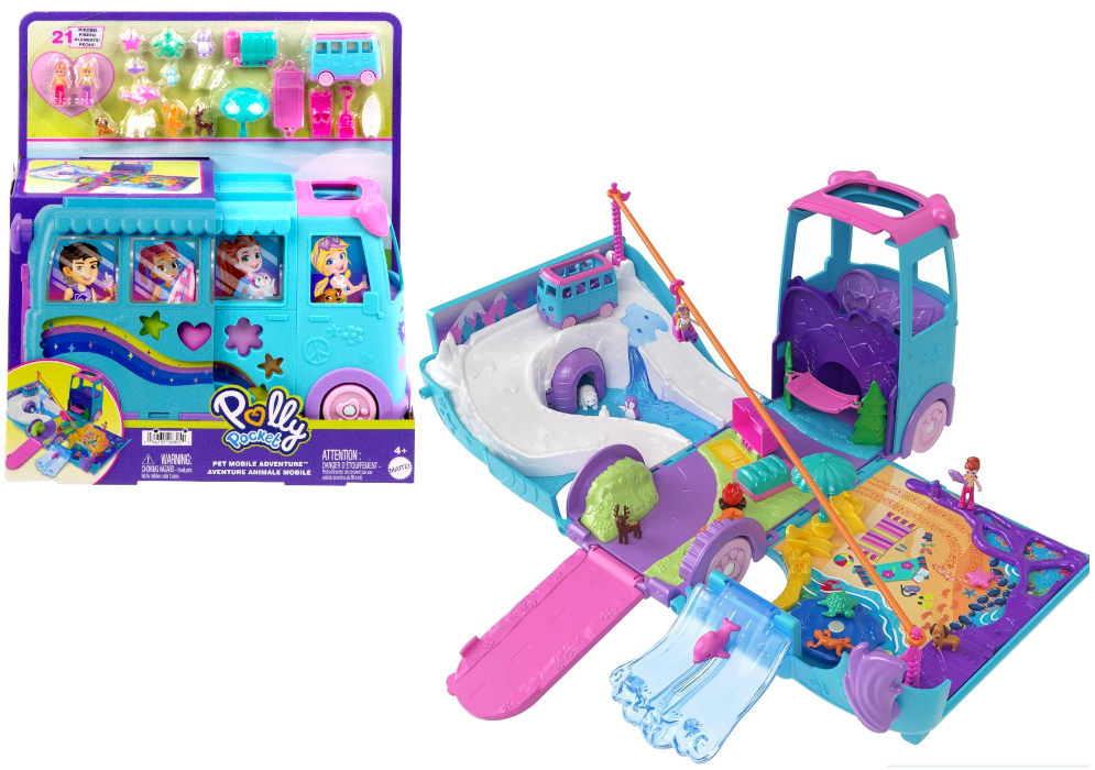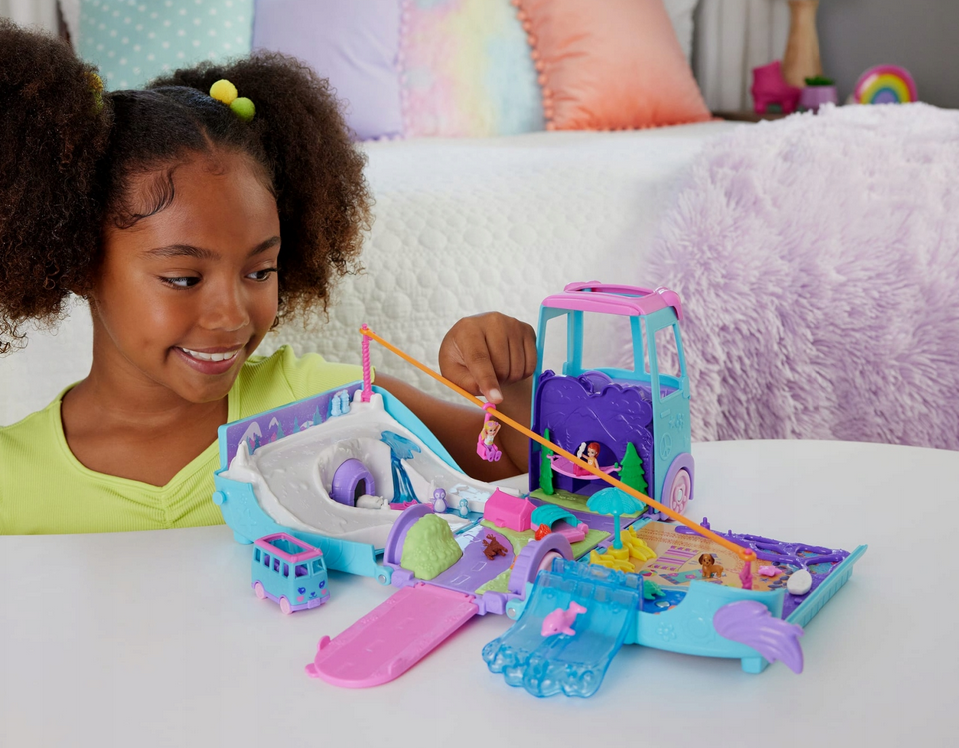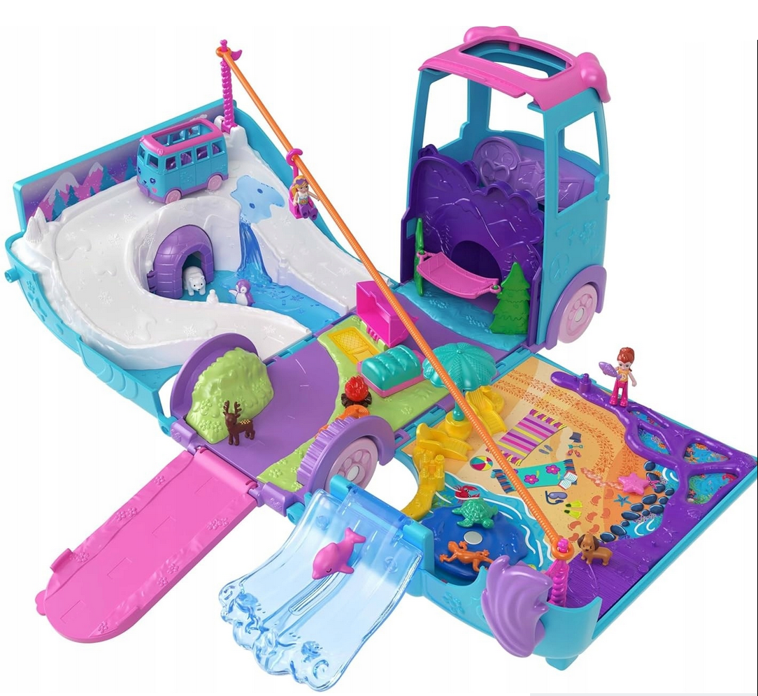 Polly Pocket Kamper Van Podróżny od Mattel to kompaktowy zestaw, który zamienia się w pełen przygód miniaturowy świat. Na pierwszy rzut oka to uroczy kolorowy kamper, ale po otwarciu odkrywasz rozbudowaną przestrzeń do zabawy inspirowaną podróżami i naturą.