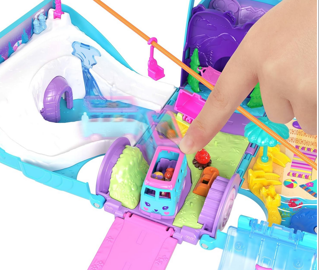 Zestaw oferuje kilka tematycznych stref, które pozwalają tworzyć różnorodne historie. Znajdziesz tu zimową krainę z lodową zjeżdżalnią, plażową przestrzeń do relaksu oraz miejsca do eksploracji z udziałem zwierząt. Każda część została zaprojektowana tak, aby pobudzać wyobraźnię i zachęcać do kreatywnej zabawy.