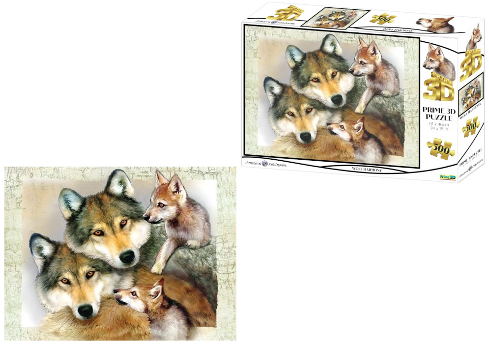 Puzzle 3D "Wilki - Wolf Harmony" to wyjątkowa propozycja dla miłośników natury i efektownych obrazów przestrzennych. Po ułożeniu otrzymujesz nie tylko klasyczną układankę, ale również obraz z efektem 3D, który zmienia się w zależności od kąta patrzenia. Scena przedstawiająca rodzinę wilków zachwyca detalami i realistycznym odwzorowaniem, dzięki czemu przyciąga wzrok i stanowi piękną dekorację wnętrza.