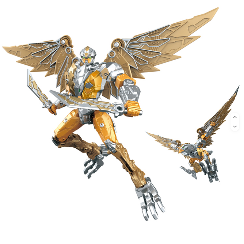 Po transformacji robot przybiera formę bojowego orła, gotowego do szybkich manewrów w powietrzu. Skrzydła są szerokie i ruchome, co pozwala Ci tworzyć dynamiczne pozy ? zarówno w locie, jak i podczas ataku. W formie robota otrzymujesz figurkę o silnym, zbrojnym wyglądzie, z charakterystycznym hełmem i precyzyjnie odwzorowanymi detalami. Do zestawu dołączono również podwójny sprzęt bojowy, który dodaje charakteru każdej scenie i umożliwia tworzenie bardziej zaawansowanych scenariuszy akcji.